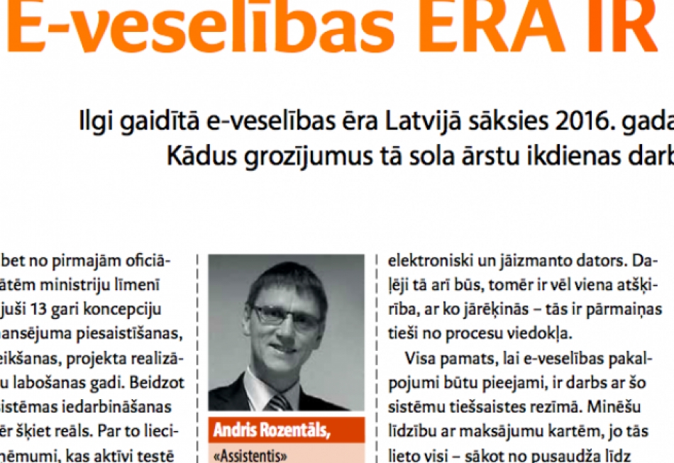 No 1/01/2016 tiek plānots, ka Latvijā tiks ieviesti E-veselības pakalpojumi. Ārstiem tas nozīmēs ne tikai darbu ar datoru, lai veiktu savu ikdienas darbu izrakstot receptes un darbnespējas lapas - tas nozīmēs arī izmaiņas pašā procesā. Šis raksts žurnālā Medicus Bonus dod nelielu ieskatu, kas tad mainīsies. Assistentis ir viens no aktīvākajiem E-veselības pakalpojumu testētājiem. Rakstu var izlasīt šeit.