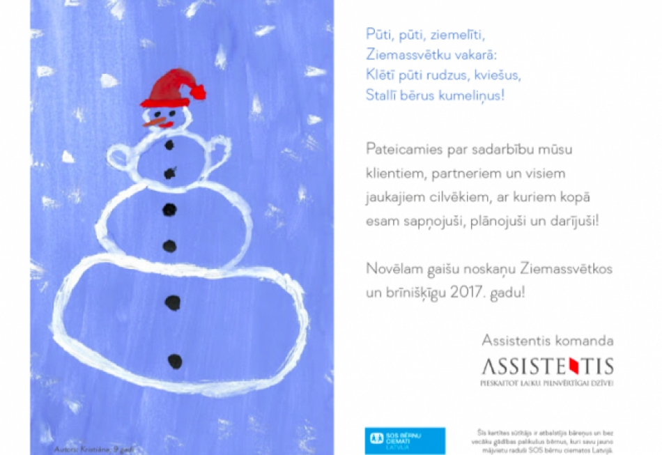 Šogad, turpinot iesākto tradīciju, mēs ziedojām "SOS bērnu ciematu asociācijai" - organizācijai kura palīdz atrast jaunu ģimeni un mājas bērniem kuri to ir zaudējuši. Ārī šo kartiņu ir zīmējis viens no viņu bērniem - Kristiāna, 9 gadi.